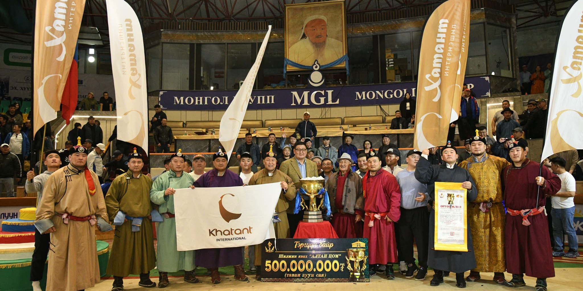 Үндэсний бөхийн спорт сонирхогчдын хүсэн хүлээдэг, нийт 1.5 тэрбум төгрөгийн шагналын сантай “Алтан цом” багийн барилдаан 2026 оны дөрөвдүгээр сарын 19-ний өдөр амжилттай өндөрлөв. Энэ удаагийн тэмцээний тэргүүн байрт Улсын заан С.Сүхбат ахлагчтай “Хатант интернэйшнл” баг шалгарч, аваргын алтан медаль, өндөр мөнгөн шагналын эзэн боллоо.