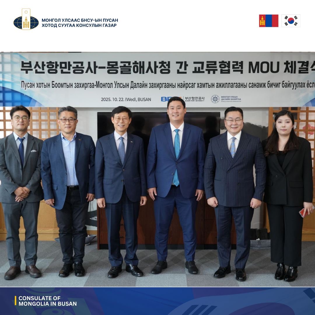 Монгол Улс гадаад худалдааны тээврийн шинэ гарцтай боллоо. 2025 оны аравдугаар сарын 22-нд Монгол Улсын Далайн захиргааны дарга М.Өлзий, БНСУ-ын Пусан хотын Боомтын захиргааны захирал Сун Сан Гын нар Пусаны олон улсын боомтыг Монгол Улс руу албан ёсоор нээх тухай санамж бичигт гарын үсэг зурлаа.