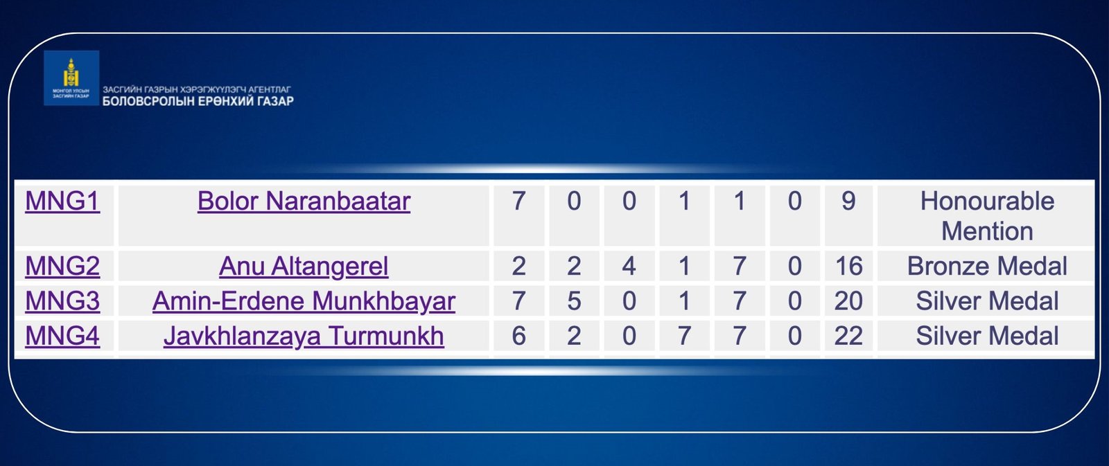 - Мөнхбаярын Амин-Эрдэнэ /Шинэ-Үе сургууль/ — Мөнгөн медаль