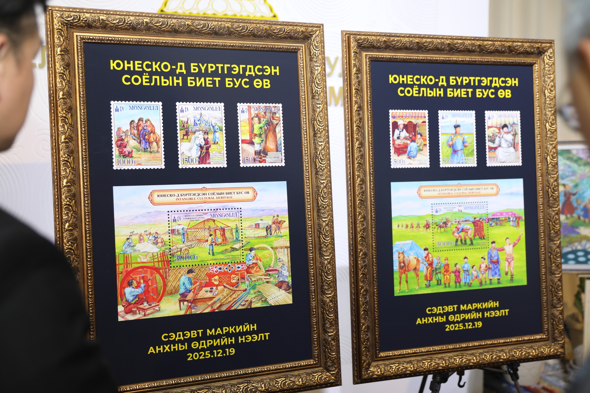 “Монгол шуудан” ХК-иас “ЮНЕСКО-д бүртгүүлсэн Монголын соёлын биет бус өвүүд” сэдэвт хоёр дахь ээлжийн маркийг 2025 оны 12 дугаар сарын 19-ний өдөр албан ёсоор гүйлгээнд гаргалаа. Өмнө нь 2019 онд Төрийн их хуурч Г.Жамъяангийн ойд зориулан эхний цувралыг хэвлэж байсан бол энэ удаа 2 блок, 6 өөр төрлийн зурагтай маркийг олон нийтэд танилцуулж байна.