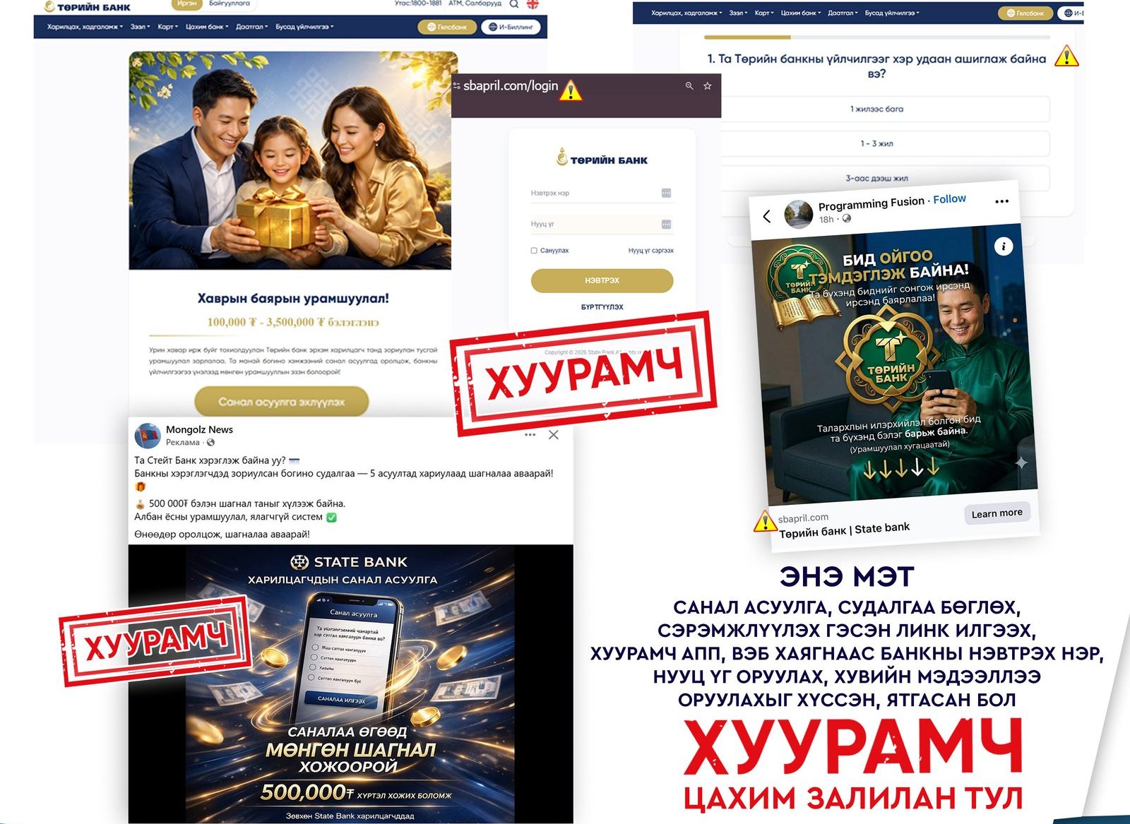 Залилагч этгээдүүд банкны албан ёсны вэб сайтыг дуурайлган хийх замаар иргэдийн хувийн мэдээллийг хулгайлах аргыг түгээмэл ашиглах болжээ. Тухайлбал, Төрийн банкны нэрийг барьж “Хаврын баярын урамшуулал” гэх хуурамч зар түгээж буй sbapril.com гэх мэт сайтуудад банкны нэвтрэх нэр, нууц үгээ оруулахгүй байхыг харилцагчдад анхааруулж байна. Ийм төрлийн сайтууд нь иргэдийн итгэлийг олж, дансны мэдээллийг нь авах зорилготой байдаг тул ямар ч тохиолдолд сэжигтэй холбоос дээр дарж болохгүй юм.