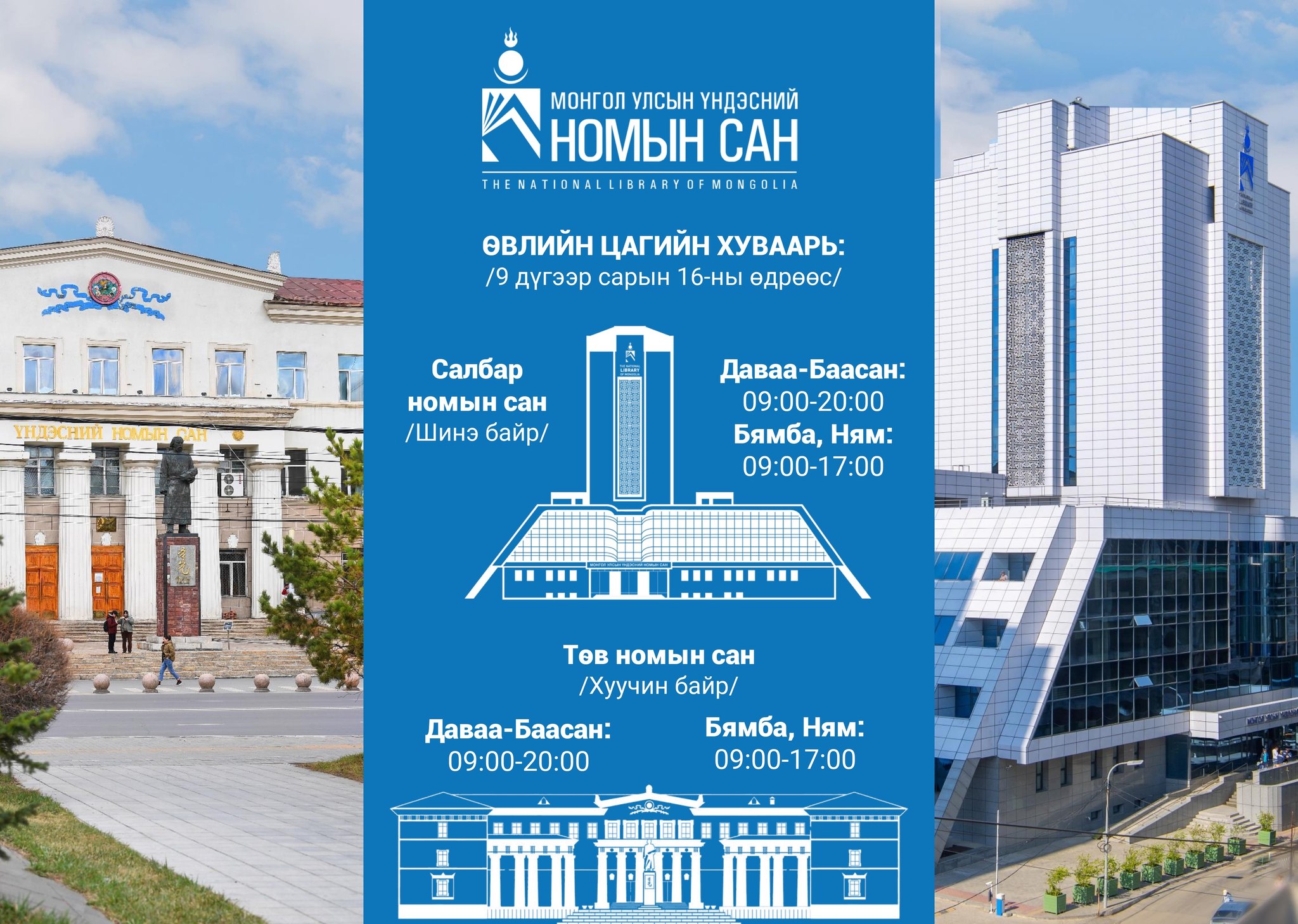 Монгол Улсын Үндэсний номын сан есдүгээр сарын 16-наас эхлэн өвлийн улирлын ажлын горимд шилжин, уншигчдад хоёр ээлжээр үйлчлэхээр боллоо.